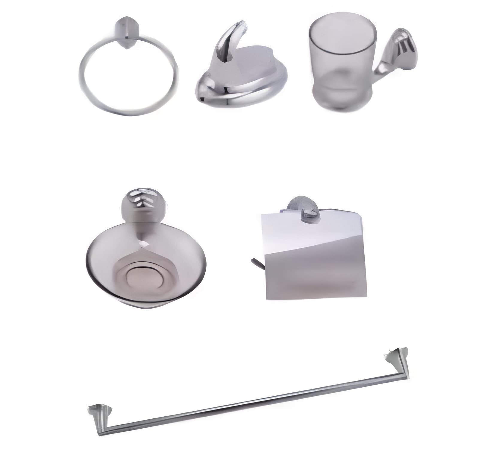Accesorios para baño de acero inoxidables con vaso y plato de vidrio transparentes.